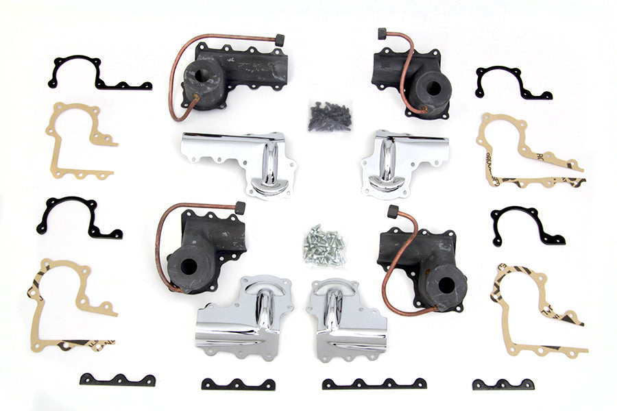 ***LIMITED ITEM PLS ALLOW 4 BUSINESS DAYS HANDLING TO SHIP*** Lower valve spring cup set includes 4 piece set of parkerized lower valve spring cups and chrome covers with oil lines and nuts attached. Kit also includes rocker cover strip set with screws and cover set with chrome finish for Knucklehead. *SHOP TIP: When fitting Knucklehead lower valve spring cover cups use two top motor mount kit bolt set to secure the tins to the ears on the head. FITS HARLEY: 1938-1940 EL, 1941-1947 FL,