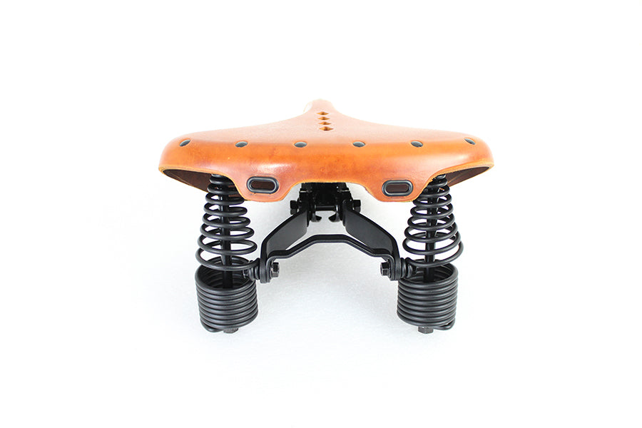 ***LIMITED ITEM PLS ALLOW 4 BUSINESS DAYS HANDLING TO SHIP*** Early style honey brown leather Troxel solo saddle includes the front hair pin spring set which is a lower seating position than the #47-0805 the later model version without the front hair pin spring Spring assembly and mounts features a black finish. Restoration quality! *NOTE: Does not have the Troxel wing logo stamped as original. Generally used on 1914-1917 models for a lower seating position. *NOTE: Dark brown leather Troxel saddles are assembled with black nickel plated rivets gloss black dual rear springs and bracket carriage. Seat top has 2 inserts for attaching tool bag straps and reinforced rear slots for the tool bag. Seats mount with single post clamp included. FITS HARLEY: 1914-1917 F,