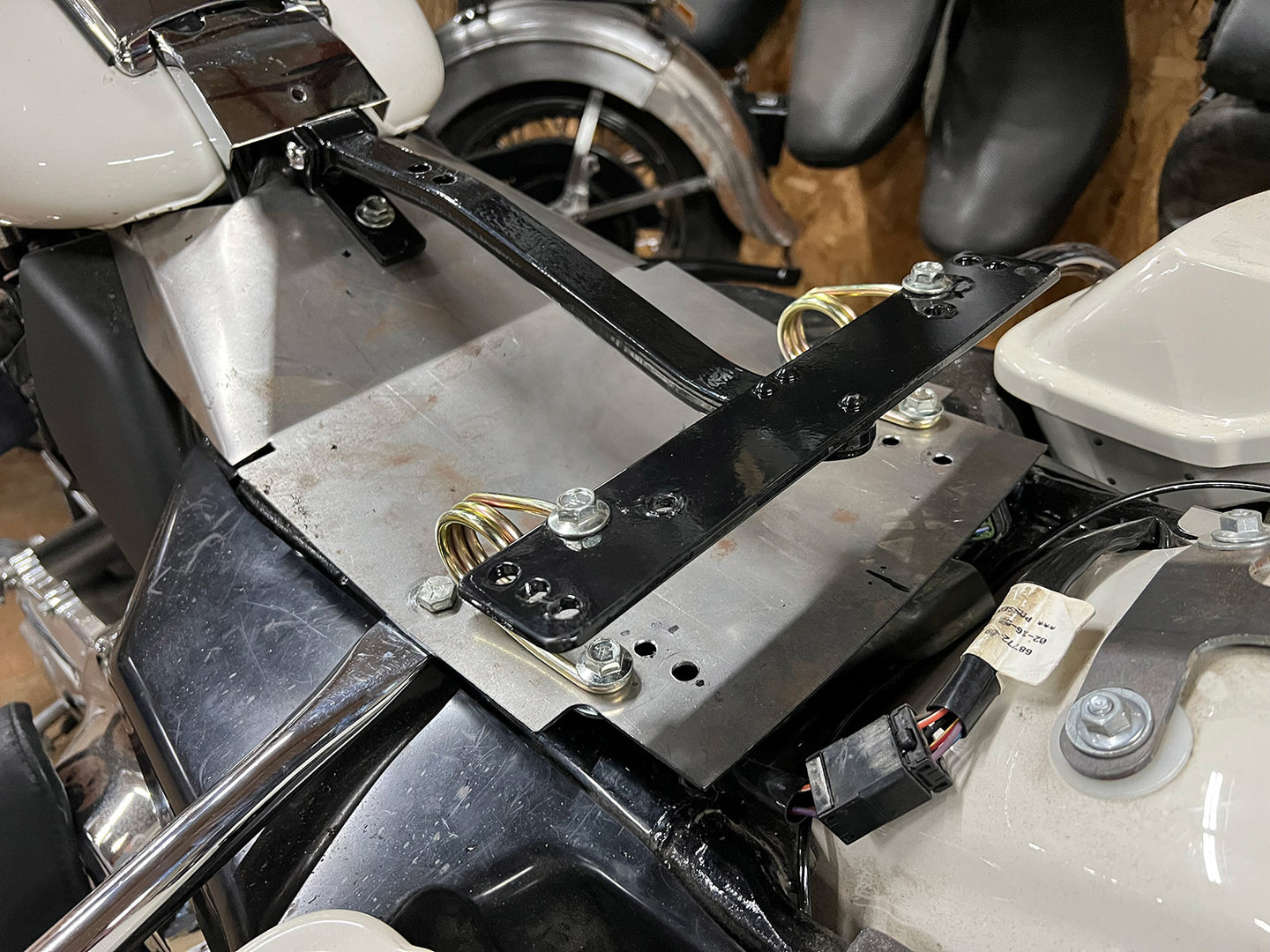 ***LIMITED ITEM PLS ALLOW 4 BUSINESS DAYS HANDLING TO SHIP*** This steel frame cover allows the mounting of a police solo seat inchT inch kit and features a black finish. Hardware provided is zinc plated. Includes hole pattern to mount both types of seat inchT inch kits. *NOTE: Plate has holes for 1997-up Touring. Mount plate to rear frame cap screws in rear and rear tank screw with bolt and nut to frame in rear of tank screw. FITS HARLEY: 2008-UP FLT,